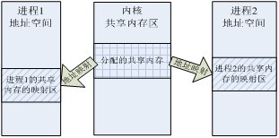 可以說,共享內存是一種為高效的進程間通信方式,因為進程可以直接讀寫內存,不需要任何數據的復制。為了在多個進程間交換信息,內核專門留出了一塊內存區,這段內存區可以由需要訪問的進程將其映射到自己的私有地址空間。因此,進程就可以直接讀寫這一內存區而不需要進行數據的復制,從而大大提高了效率。當然,由于多個進程共享一段內存,因此也需要依靠某種同步機制,如互斥鎖和信號量等。其原理示意圖如圖1所示。