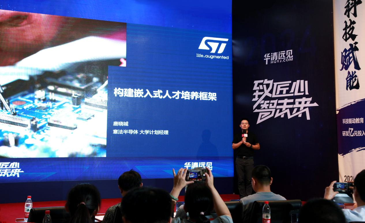 ST公司大學計劃經理唐曉城進行了《構建嵌入式人才培養框架》的精彩分享。作為重要合作伙伴,ST與華清遠見在MPU/MCU等嵌入式領域有深入合作,并合力打造了《智能手表》課程,用于嵌入式人才培養。在此次分享中,唐曉城先生深度分析了嵌入式人才需求的痛點、嵌入式應用人才生態愿景、技術人才認證體系等人才培養計劃,致力于攜手多方合作伙伴建立系統的人才培養和衡量標準,應對井噴式的嵌入式人才需求。