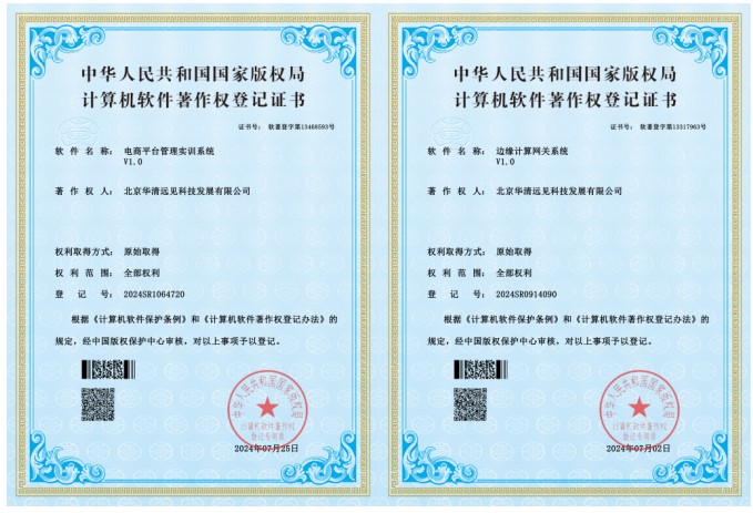 2024年7月,由華清遠(yuǎn)見(jiàn)自主研發(fā)的“電商平臺(tái)管理實(shí)訓(xùn)系統(tǒng)”、“邊緣計(jì)算網(wǎng)關(guān)系統(tǒng)”通過(guò)中國(guó)版權(quán)保護(hù)中心審核,并取得國(guó)家版權(quán)局頒發(fā)的計(jì)算機(jī)軟件著作權(quán)登記證書。