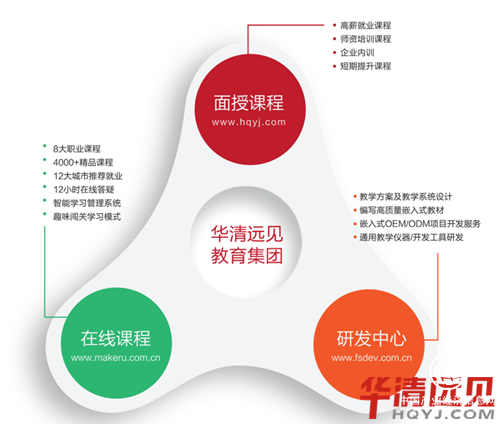 華清遠見成立于2004年,集團從成立最初的單一嵌入式學科,到現在已包括嵌入式、物聯網、JavaEE、HTML5、Python+人工智能等眾多高端IT學科培訓;從屈指可數的幾間教室,發(fā)展成為分布于北京、上海、深圳、成都、南京、武漢、西安、廣州、沈陽、重慶、濟南、長沙12所城市直營中心的規(guī)模。目前旗下也已擁有“面授課程”“創(chuàng)客學院”“研發(fā)中心”三大業(yè)務板塊。