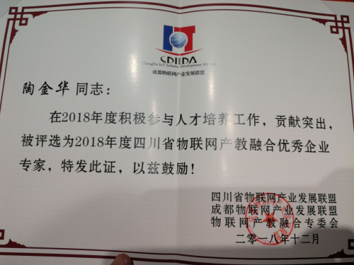 會議上,物聯網產教融合專委會的多名成員分別匯報了2018年專委會工作情況和物聯網產教融合專家工作站項目與人才白皮書工作進展,各位企業大咖及高校代表依次做了主題分享。大會還進行了優秀企業專家的評選及頒獎儀式,華清遠見區域運營副總裁兼校長陶金華老師在此次大會上榮獲“2018年度四川省物聯網產教融合優秀企業專家”獎項。