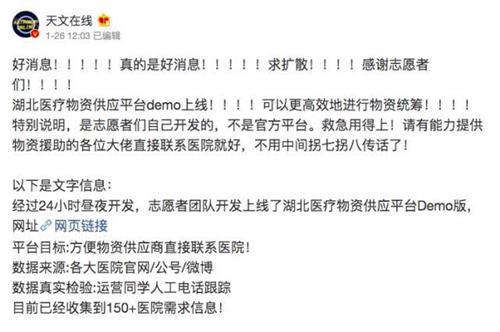 為了解決醫療物質信息不對稱短缺問題,由幾個程序員組成的志愿者團隊爭分奪秒,經過24小時晝夜開發,一個可高效快速對接醫院的物資捐助平臺“湖北醫療物資需求對接平臺”火速上線。