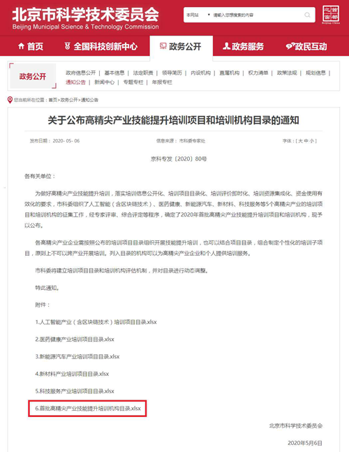 2020年5月6日,北京市科學技術(shù)委員會進行的“高精尖產(chǎn)業(yè)技能提升培訓項目和培訓機構(gòu)”征集工作評審結(jié)果公布。經(jīng)專家評審、綜合評定等多層遴選程序,華清遠見教育集團憑借“產(chǎn)學研一體化“的特色發(fā)展模式,及強大的硬核技術(shù)實力和自主研發(fā)能力,成功入選“2020年首批高精尖產(chǎn)業(yè)技能提升培訓機構(gòu)”。同批入選的還有清華大學、北京大學、工業(yè)和信息化部教育與考試中心、百度等眾多高等學府及企業(yè)機構(gòu)。