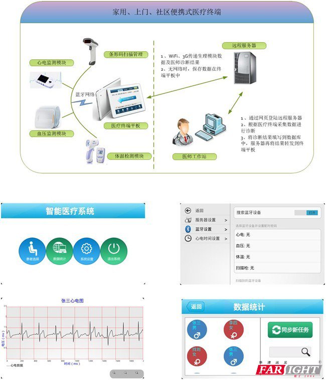 便攜式智能醫(yī)療系統(tǒng)基于最新的物聯(lián)網(wǎng)技術(shù)及移動(dòng)平臺終端,總結(jié)傳統(tǒng)醫(yī)療設(shè)備的優(yōu)缺點(diǎn),適應(yīng)國家衛(wèi)生部門提倡基礎(chǔ)醫(yī)療設(shè)備入社區(qū),即:社區(qū)醫(yī)療的建議,而研 發(fā)出來的新型終端醫(yī)療設(shè)備系統(tǒng)。它具有:攜帶方便(適合社區(qū)上門服務(wù))、功耗小(醫(yī)療設(shè)備全部電池供電)、運(yùn)行穩(wěn)定(使用目前最先進(jìn)的醫(yī)療傳感器技術(shù))、 操作方便(專門個(gè)性化定制操作系統(tǒng))、病歷及病情智能分析(通過報(bào)表及各種圖例展示病情及病歷)、遠(yuǎn)距離專家診療等優(yōu)點(diǎn),同時(shí),大大提高社區(qū)醫(yī)護(hù)人員工作 效率。