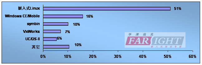 在軟件開發平臺的選擇上,嵌入式linux占據了明顯的優勢??51%),Linux以其開源成??低的優勢受到??小企業的歡迎,排名二三的Windows CE和Symbian,所占比例分????16%??10%