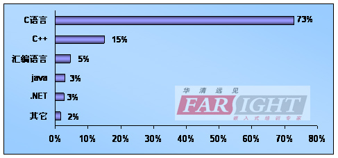 在軟件開發???言的使用上,C??言作為嵌入式開發經常使用的??言的地位也??無???置疑的,所占比例高??73%,C++所占比例為15%,位居???二,其他開發???言均占??了較少的比例??