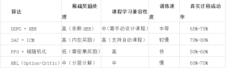針對機器人抓取的稀疏獎勵問題,內(nèi)在獎勵引導探索與HER增強經(jīng)驗復用是提升樣本效率的核心;結(jié)合漸進式課程學習與域隨機化,可顯著提高策略魯棒性與跨域遷移能力。實際部署中需權(quán)衡訓練速度與穩(wěn)定性,選擇DDPG+HER或SAC+ICM等組合,并通過并行化加速迭代。未來,隨著自動課程生成與多模態(tài)感知的融合,RL在復雜抓取任務中將進一步逼近人類水平。