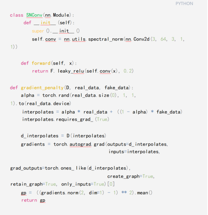 在實(shí)際中,兩者結(jié)合使用可以取長(zhǎng)補(bǔ)短。譜歸一化控制網(wǎng)絡(luò)整體尺度,而梯度懲罰則精 細(xì)約束輸入輸出的敏感度。