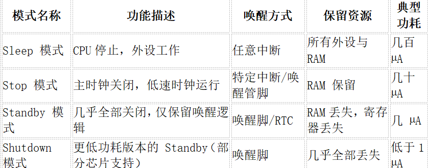 嵌入式MCU通常支持以下幾種低功耗模式(以 STM32 為例):