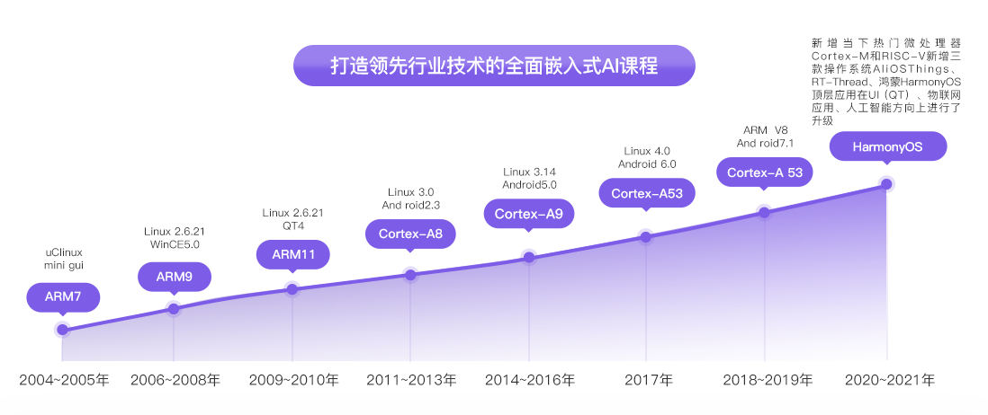 第四代課程在原有Cortex-A、Cortex-M的基礎上新增了RISC-V微處理器。得以實現更多的實戰項目處理,填補了市場上這一處理器學習的空白。