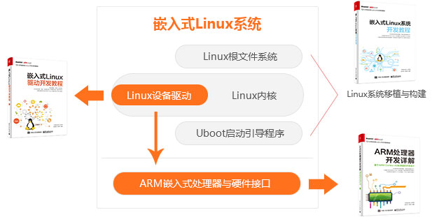 Linux驅(qū)動開發(fā)不僅要掌握Linux操作系統(tǒng)內(nèi)核及驅(qū)動框架知識,底層ARM處理器和接口技術(shù)知識、啟動引導(dǎo)程序Uboot、Linux系統(tǒng)移植、文件系統(tǒng)部署是關(guān)鍵基礎(chǔ),也必不可少。只有系統(tǒng)的掌握這3個部分的知識,才能融會貫通,真正掌握Linux設(shè)備驅(qū)動。目前市面上的相關(guān)教材大多側(cè)重于1個方向,華清遠見策劃推出3本全套教材。
